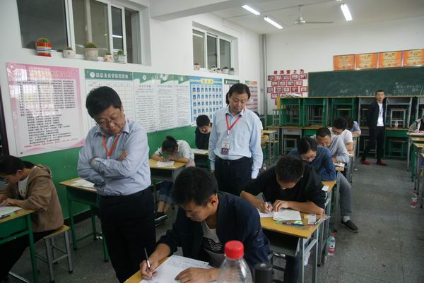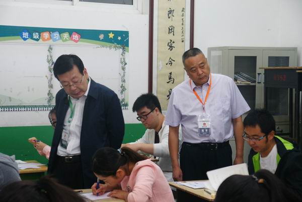 市政府副市长、市公安局局长张明(右),市政协副主席、市司法局局长苏世强(左)在考场巡察